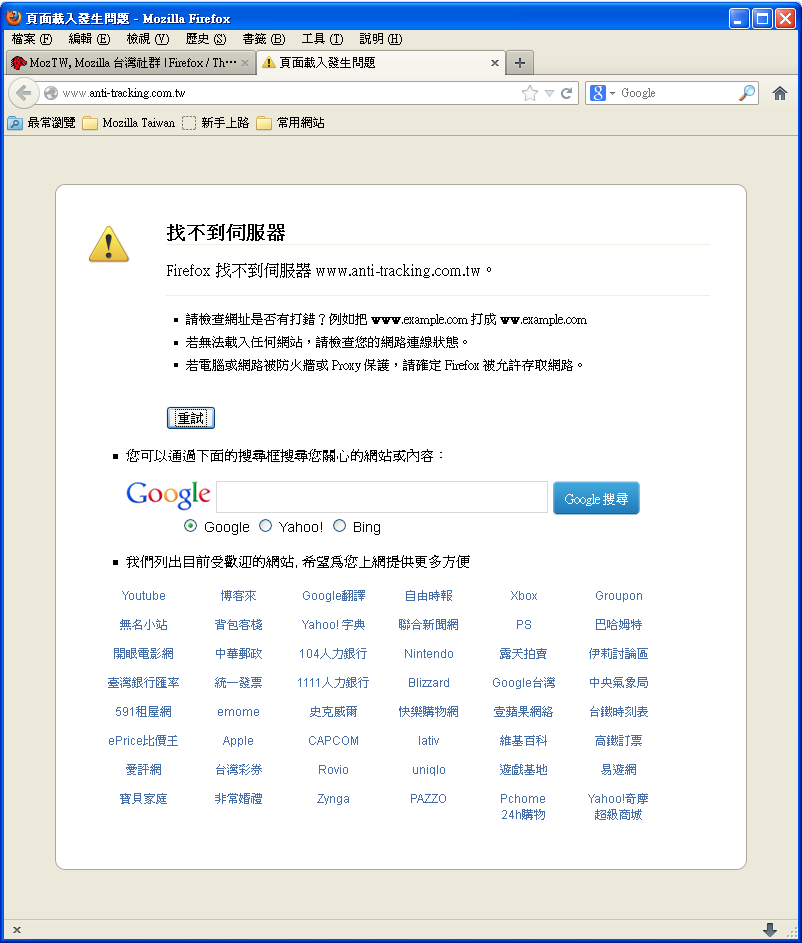 如本頁各項連結因 Mozilla Taiwan 公司網站修改而失效,請至 moztw-general 郵件群組 回報,我們將會儘速修復。